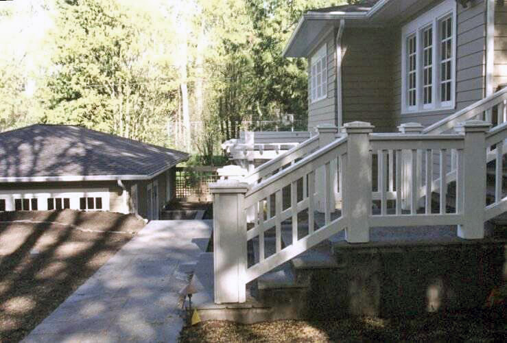 On the ground floor of the original dwelling, the kitchen, dining, and living rooms were extended, and the front porch was reconfigured to provide a new covered entry. At the rear of the house, a new stairway led from a patio outside the main living area down to a newly created lawn. This lawn had been raised from its original height to an intermediate level which would better relate to the house and allow the parents to watch their children while at play.